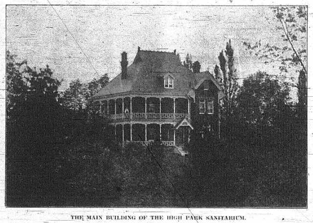 В разные годы здание, которое служило помещением для High Park Sanitarium, использовалось с разными целями. Сначала это были роскошные апартаменты для одного из мэров Торонто, роддомом, заброшенным сооружением и, наконец, пентхаусом на семь кондоминиумов. Наибольшую популярность это место получило, когда здесь действовал High Park Sanitarium. Владельцы заведения беспокоились, чтобы посетители могли получить самые качественные услуги и постоянно совершенствовали методы своей деятельности. Далее на itoronto.